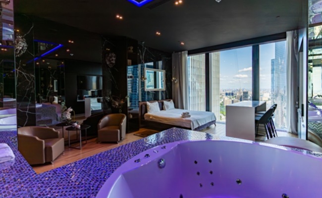 В апартаментах вас ждут: • профессиональный сервис, внимательный персонал; • стильный интерьер с итальянской отделкой; • огромная кровать формата king size; • комбинация стекла, света и камня; • романтическая подсветка; • гидромассажная ванна с панорамным окном и тантра-кресло для пар.